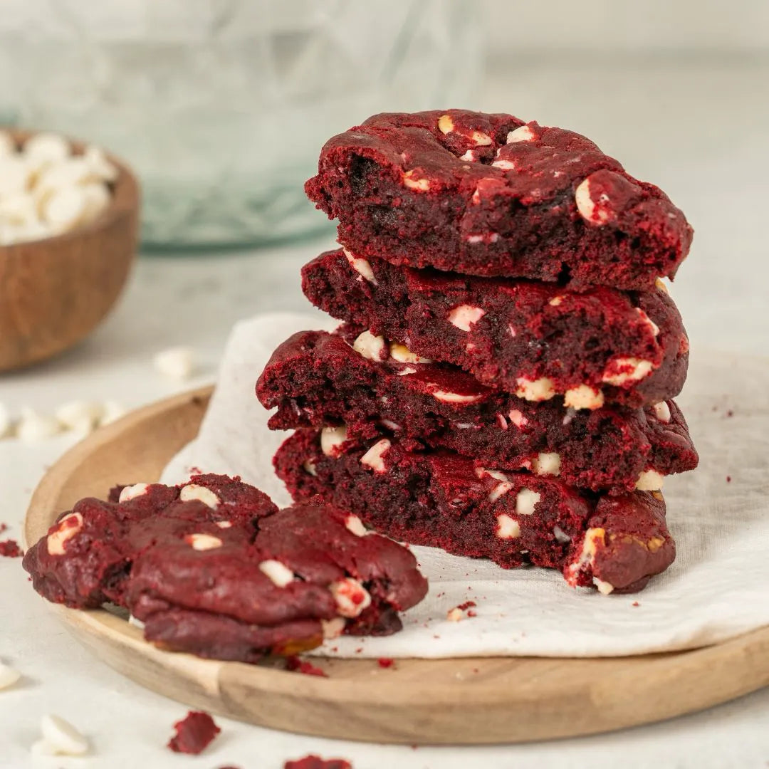 Disfruta la esencia del aclamado pastel Red Velvet en forma de galleta, con esta esquisita receta que combina un interior aterciopelado de color rojo profundo con chips blancos y un sutil sabor a cacao.
