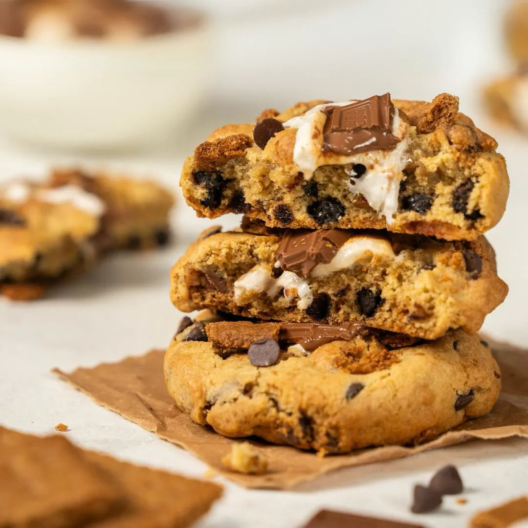 Ideales para los fanáticos del clásico postre de fogata, las S'mores Cookies llevan el sabor nostálgico a otro nivel. Con una masa suave y gruesa, estas galletas combinan trozos de chocolate, malvaviscos tostados y crujientes galletas graham, logrando el equilibrio perfecto entre lo dulce y lo crujiente en cada bocado.